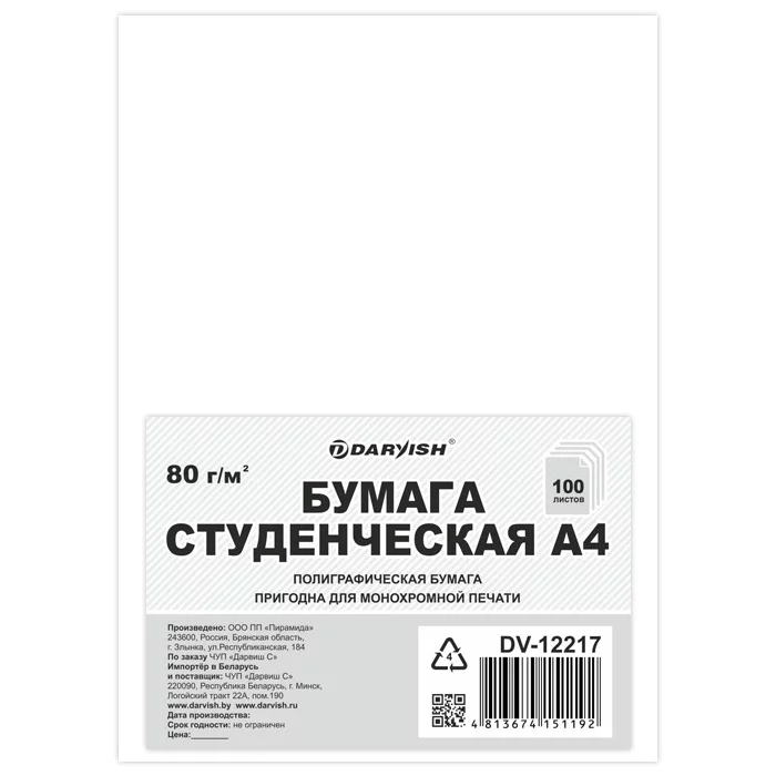 Бумага студенческая А4 100л Darvish 80г/м2 DV-12217