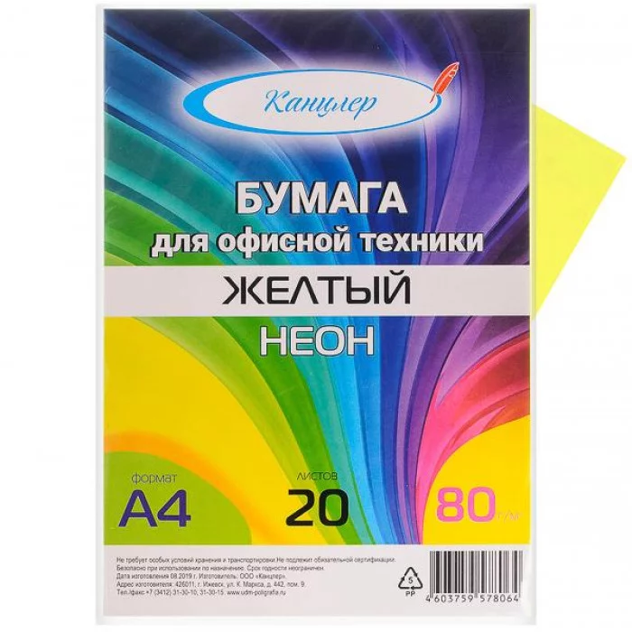 Бумага цветная А4 80г/м2 неон 20л желтый КАНЦЛЕР 578804 460931