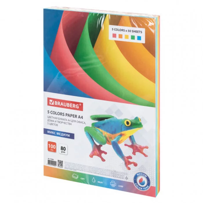 Бумага цветная BRAUBERG, А4, 80 г/м2, 100 л. 5 цветов х 20 медиум, для офисной техники, 112462