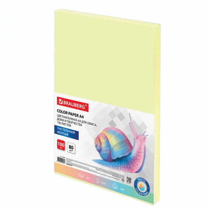 Цветная бумага BRAUBERG предназначена для использования в офисе и дома. Идеально подойдет для офисной техники, оформления писем и приглашений, в качестве разделителей для архивации, а также для детского творчества (изготовления поделок и аппликаций). Упакована в пачки по 100 листов формата А4. В упаковке бумага пастельного тона желтого цвета. Листы бумаги плотностью 80 г/м2 подходят для офисной техники.Поставляется в упаковке «полибэг» (Polybag), которая представляет собой прочный прозрачный полиэтиленовый конверт надежно защищающий бумагу при транспортировке. С одной стороны полибэг имеет заклеивающийся клапан, что предоставляет возможность многократно открывать и закрывать упаковку.Цветопередача монитора может искажать реальный цвет бумаги. Формат: А4. Плотность: 80 г/м2. Количество листов в пачке: 100. Количество цветов в пачке: 1. Тон: пастельный. Оттенок: желтый. Двусторонняя бумага: да. Серия: Standard pastel. Количество пачек на палете: 1000 шт. Бренд - BRAUBERG. Производитель - Россия. Артикул - 11