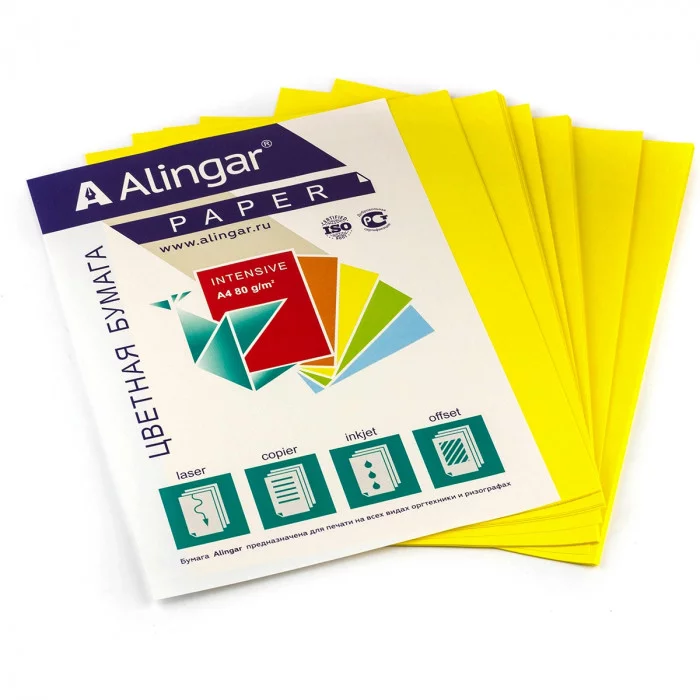 Бумага цветная для офиса А4, 50л., Интенсив "Желтый", Alingar, 80г/м2, пленка т/у AL6747