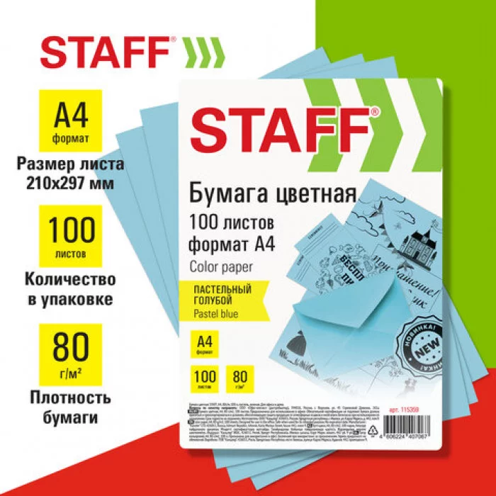 Бумага цветная STAFF, А4, 80 г/м2, 100 л. пастель, голубая, для офиса и дома, 115359