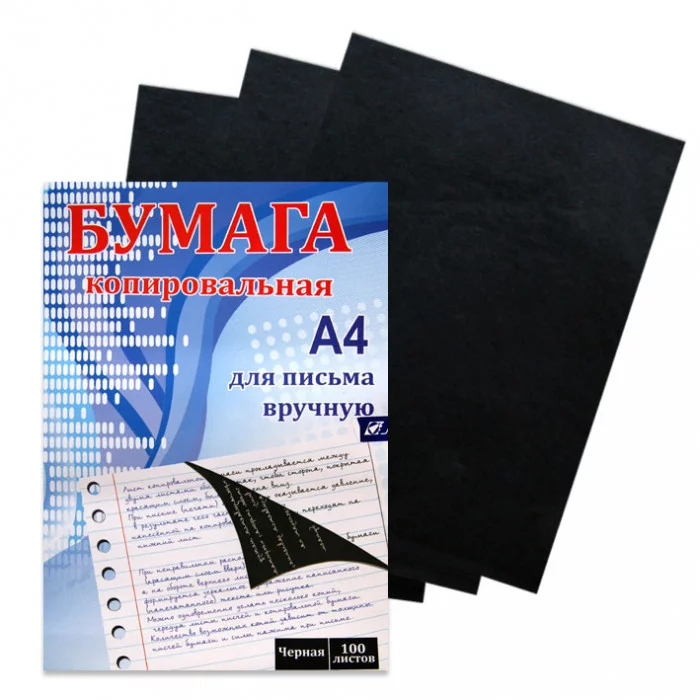 Копировальная бумага чёрного цвета, подходящая для рукописных работ и пишущих машинок. Папка, изготовленная из плотного ламинированного картона, защищает бумагу от деформации и загрязнения. Внутренний блок упакован в дополнительную плёнку, что увеличивает срок службы и защищает от высыхания бумаги. В папке содержится 100 листов стандартного формата А4.