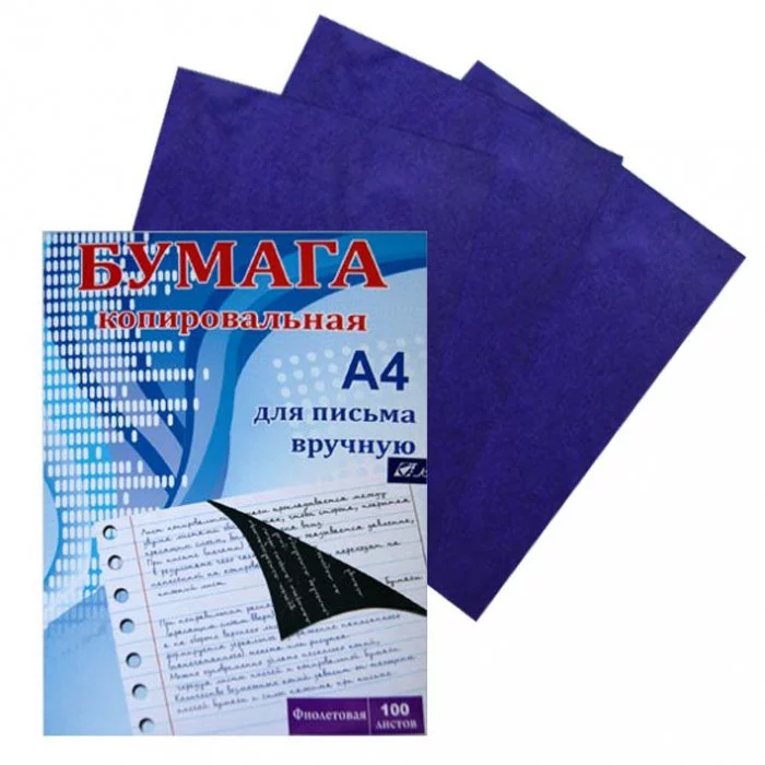 Копировальная бумага фиолетового цвета, подходящая для рукописных работ и пишущих машинок.