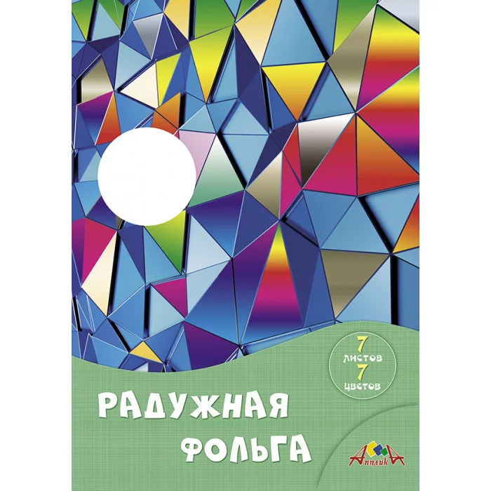 Цветная радужная фольга, 7 листов, 7 цветов, формат А4, плотность 120 гр/м2. Внутренний блок - металлизированная пленка разных цветов на бумажной основе. В наборе цвета: зеленый, синий, серебряный, золотой, желтый, красный, фиолетовый. Упаковка - папка из