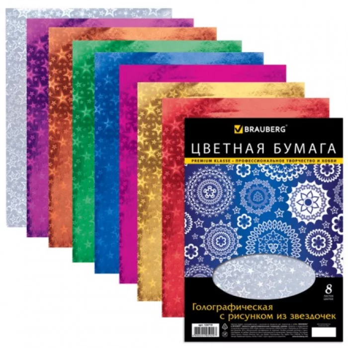 Цветная бумага А4 ГОЛОГРАФИЧЕСКАЯ, рис. из звезд, 8л., 8цв., BRAUBERG, 210х297мм, 124719