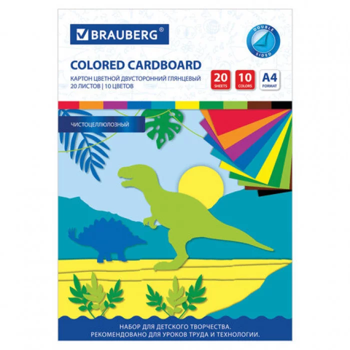 Набор цветного картона BRAUBERG предназначен для творчества и хобби и может использоваться детьми с трехлетнего возраста. Картон рекомендован для уроков труда и технологии. Творческая инструкция по созданию аппликации на обороте. Двусторонний целлюлозный мелованный картон BRAUBERG с улучшенной прокраской обладает плотностью 200 г/м2, имеет глянцевую поверхность с одной стороны и матовую с другой, благодаря чему сохраняет четкость, яркость и насыщенность оттенка на протяжении длительного времени. Картон легко режется ножницами, сгибается и клеится. Внутренний блок закрашен с двух сторон и состоит из 20 листов формата А4 и 10 цветов. Картон вложен в красочную картонную папку, которая имеет дополнительный нижний клапан, благодаря чему листы не выпадут и не помнутся. Формат: А4. Количество листов: 20. Количество цветов: 10. Тип картона: мелованный, с улучшенной прокраской. Двусторонний: да. Плотность картона: 200 г/м2. Тип товара: картон цветной мелованный двусторонний EXTRA. Дизайн: Динозавры. Длина: 200 мм. Шир