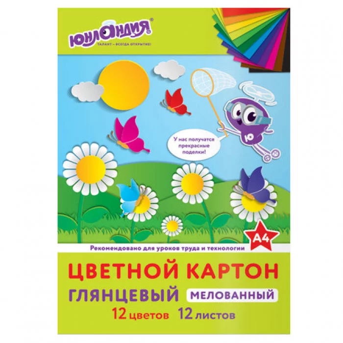 Картон цветной А4 МЕЛОВАННЫЙ (глянцевый), 12 листов 12 цветов, в папке, ЮНЛАНДИЯ, 200х290 мм, "ЮНЛАНДИК НА ПОЛЯНКЕ", 129566