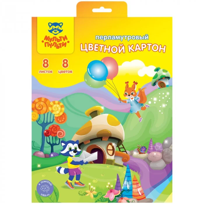 Картон цветной А4, Мульти-Пульти, 8л., 8цв., перламутровый, в папке с европодвесом, "Приключения Енота" 258907