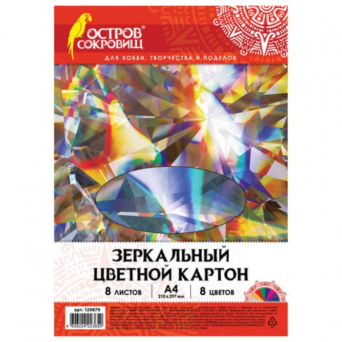Картон цветной, А4, ЗЕРКАЛЬНЫЙ, 8 листов 8 цветов, в папке, 180 г/м2, ОСТРОВ СОКРОВИЩ, 210х297 мм, 129879