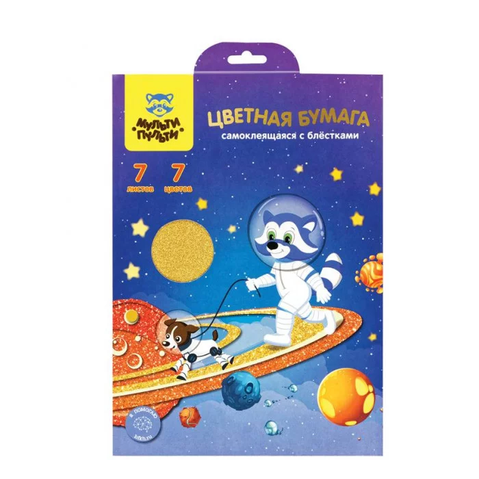Цветная бумага самоклеящаяся А5, Мульти-Пульти, 7л., 7цв., с блестками, в папке с европодвесом, "Енот в космосе" 318596