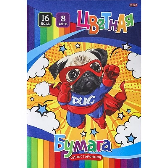 Бумага цветная Проф-Пресс, 166х240 мм, немелованная, односторонняя, 16 листов, 8 цветов, на скрепке, "Супермопс"