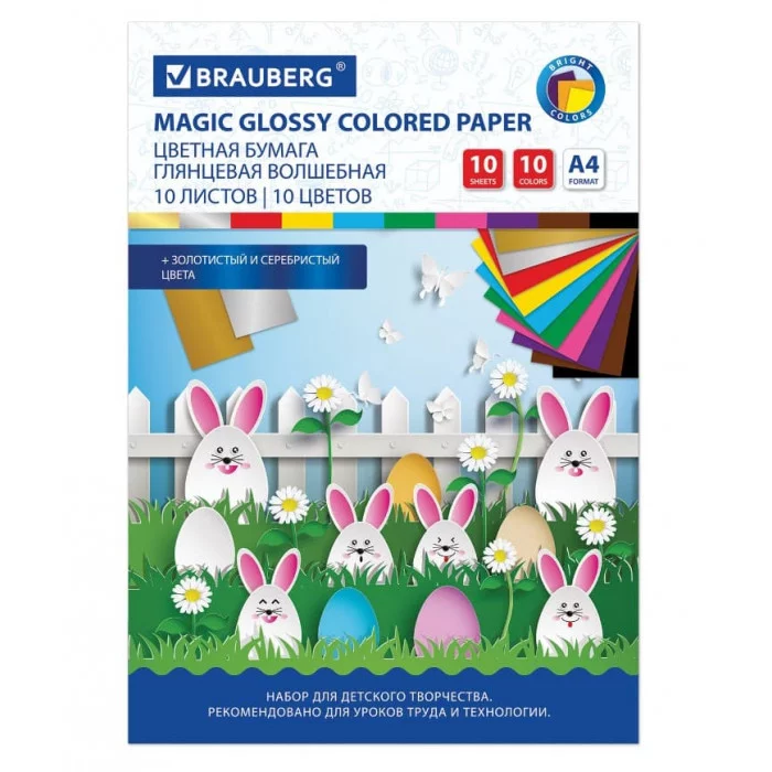 Цветная бумага А4 мелованная (глянцевая), ВОЛШЕБНАЯ, 10 листов 10 цветов, на скобе, BRAUBERG, 200х275 мм, "Зайчата", 129926