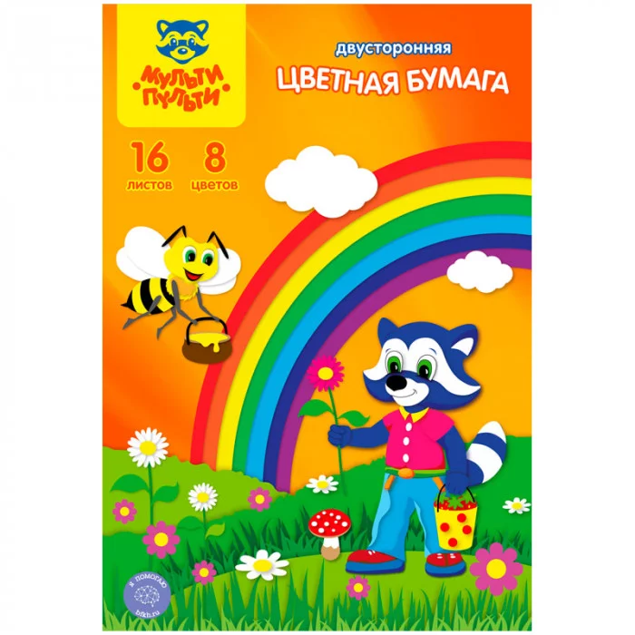 Цветная бумага двустор. A4, Мульти-Пульти, 16л., 8цв., офсетная, в папке Мульти-Пульти 250430