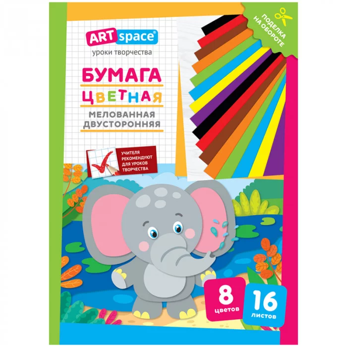Цветная бумага двусторонняя A4, ArtSpace, 16 листов, 8 цветов, мелованная, "Слон" 291743