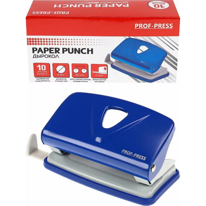Металлический дырокол обеспечивает лёгкое и точное пробивание бумаги. Контейнер для конфетти поможет сохранить рабочее место в чистоте. Количество пробиваемых листов: 10. Количество пробиваемых отверстий: 2 шт. Диаметр пробиваемого отверстия: 6 мм. Расстояние между отверстиями: 80 мм. Форматная линейка: 11 мм. Цвет корпуса: синий. Упаковка: картонная коробка.