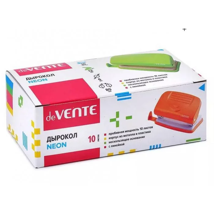 Дырокол deVENTE "Neon", зеленый, на 10 листов, пластиковый, с линейкой, в коробке (4020325). deVENTE - бренд канцелярских товаров для школы и офиса. Все дизайны и формы разработаны дизайнерским бюро в соответствии с последними тенденциями моды и функциональности мирового канцелярского рынка. На всех стадиях проводится строгий контроль качества.