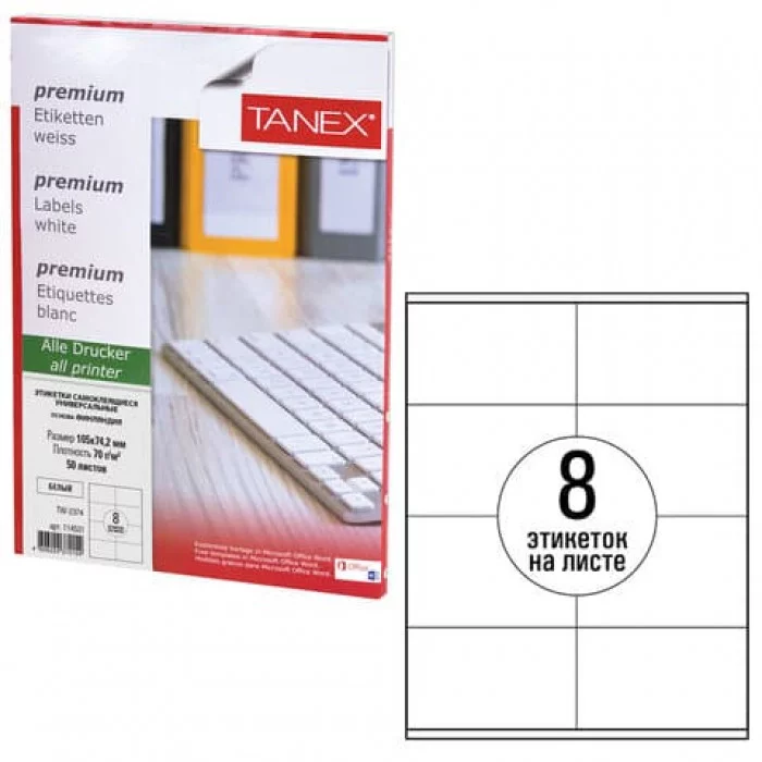 Этикетка самоклеящаяся 105х74,2 мм, 8 этикеток, белая, 70 г/м2, 50 листов, TANEX, сырье Финляндия, 114531, TW-2374