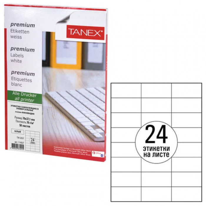 Этикетка самоклеящаяся 70х37,1 мм, 24 этикетки, белая, 70 г/м2, 50 листов, TANEX, сырье Финляндия, 114537, TW-2037