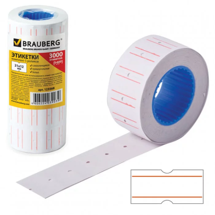Этикет-лента 21*12мм прямоугольная, белая, 5 рулонов по 600 шт., BRAUBERG, 123568