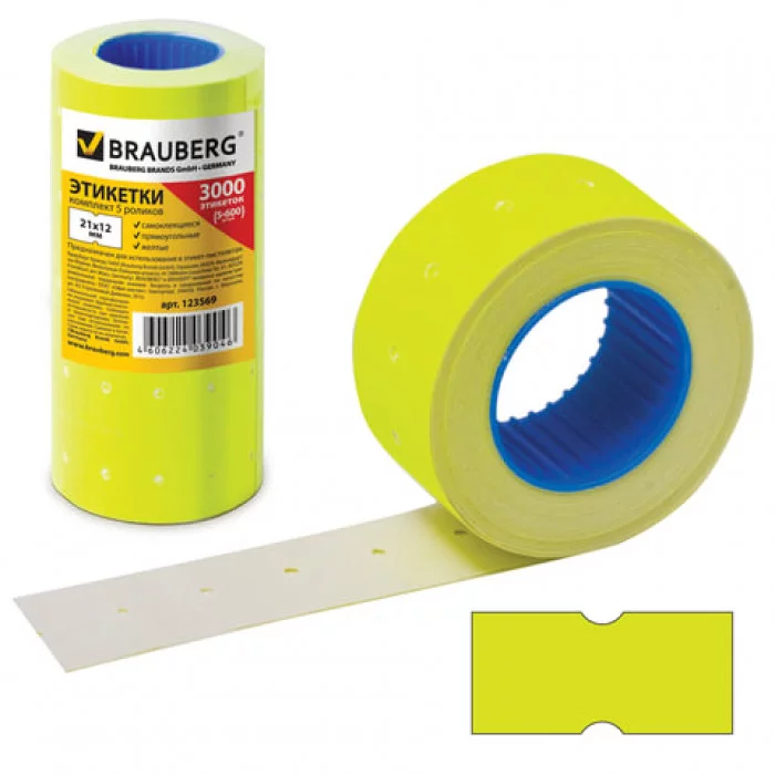 Этикет-лента 21*12мм прямоугольная, желтая, цена за 1 рулон 600 шт., BRAUBERG, 123569