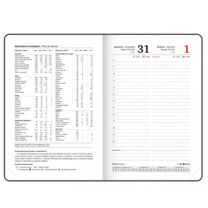Дополнением является закладка-ляссе, с помощью которой при необходимости можно быстро открыть ежедневник на нужной странице. Ежедневник снабжен обширным справочным материалом. В конце есть 4 страницы для записей и заметок.