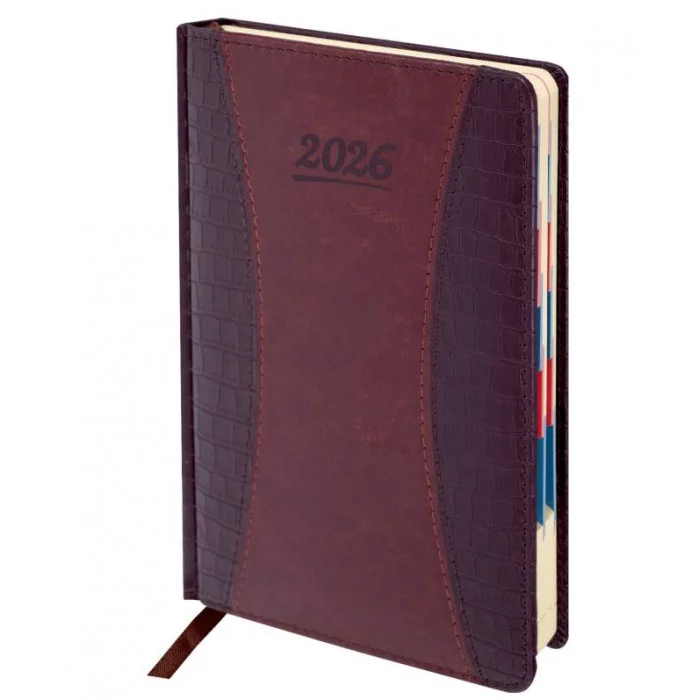 Внутренний блок включает 168 листов тонированной бумаги плотностью 70 г/м2. Каждая страничка имеет перфорированный угол. Благодаря стандартному формату А5 (148х218 мм) ежедневник удобно использовать как в офисе, так и на выездных деловых встречах. Твердая обложка коричневого цвета состоит из двух материалов и стилизована под кожу крокодила со вставкой из материала под гладкую кожу. Материал обложки подходит для горячего тиснения.