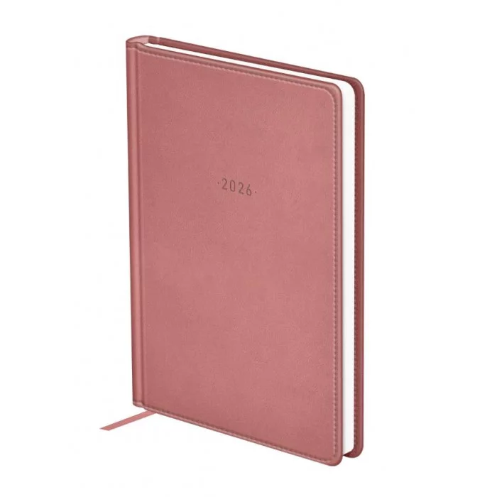 Элегантный датированный ежедневник на 2026 год BG формата А5 серии серии Winner в твёрдой обложке розового цвета, выполненной из высококачественной экокожи с гладкой матовой поверхностью и поролоновой прослойкой. Внутренний блок состоит из 176 листов белой офсетной бумаги плотностью 70 г/м2 с печатью в 2 краски. Датированный ежедневник представлен в размере 145*205 мм.