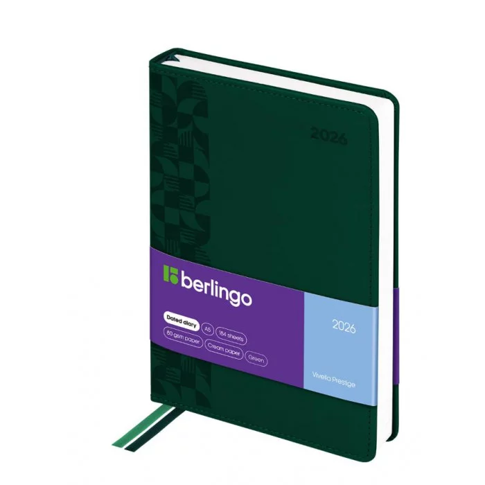 Датированный ежедневник на 2026 год Berlingo "Vivella Prestige" формата А5 идеален для повседневного использования. Размер — 150*215 мм. Модель представлена с твёрдой матовой обложкой из зелёной высококачественной экокожи. Имиджевое тиснение на обложке добавляет интересную деталь в классический дизайн.