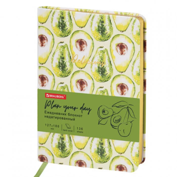 Ежедневник BRAUBERG VISTA "Avocado" предназначен для людей, которые ценят время и стараются каждый день проживать с максимальной пользой. Внутренний блок включает 136 листов белой бумаги плотностью 70 г/м2. Благодаря стандартному формату А5 ежедневник удобно использовать как в офисе, так и на выездных деловых встречах. Твердая (книжная) обложка с полноцветной печатью и тиснением золотой фольгой делает ежедневник неповторимым и запоминающимся. Срез ежедневника фольгирован золотой фольгой, что придает ему особый шарм. Дополнением является закладка-ляссе, с помощью которой можно быстро открыть ежедневник на нужной странице. Недатированный ежедневник BRAUBERG станет отличным подарком к любому празднику и событию. Тип ежедневника: недатированный. Формат: В6. Обложка: эко-кожа. Вид обложки: твердая. Количество листов: 136 шт.. Особенности: закладка-ляссе, скругленные углы. Серия: Vista. Дизайн: Avocado. Тип застежки: нет. Основной цвет обложки: с дизайном. Дополнительный цвет обложки: нет. Цвет среза: золотой. Цвет