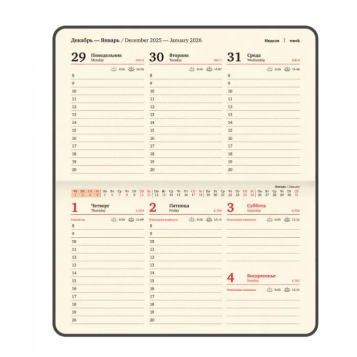 Внутренний блок включает 64 листа тонированной бумаги плотностью 70 г/м2. Благодаря малому формату А6 (95х155 мм) еженедельник удобно использовать как в офисе, так и на выездных деловых встречах.