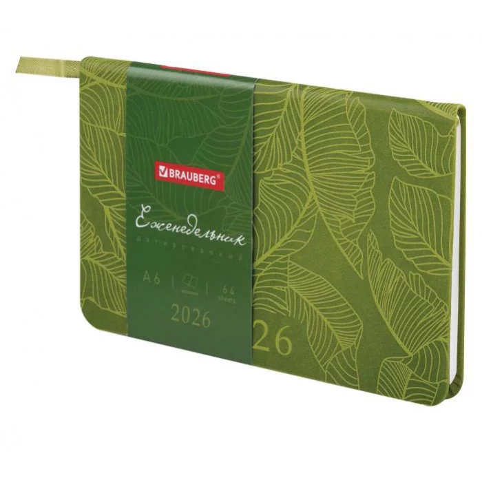 Еженедельник датированный 2026 МАЛЫЙ ФОРМАТ 95х155 мм, А6, BRAUBERG "Foliage", под кожу, зеленый, 117198