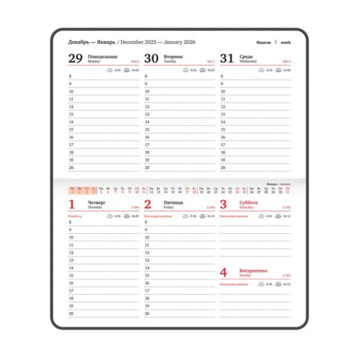 Дополнением является закладка-ляссе, с помощью которой при необходимости можно быстро открыть еженедельник на нужной странице. Для заметок в еженедельнике есть 7 страниц в конце внутреннего блока. Помимо прочего, еженедельник снабжен обширным справочным материалом.