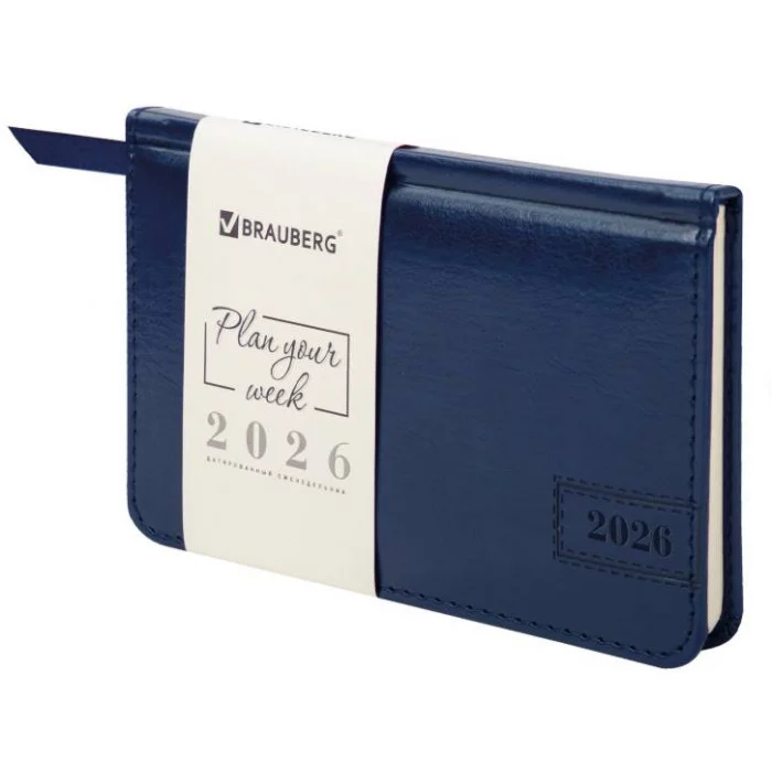 Еженедельник датированный 2026, МАЛЫЙ ФОРМАТ 95х155 мм, А6, BRAUBERG "Imperial", под кожу, синий, 117187
