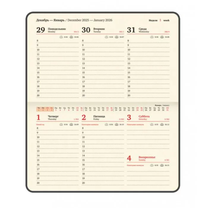 Дополнением является закладка-ляссе, с помощью которой при необходимости можно быстро открыть еженедельник на нужной странице. В конце внутреннего блока есть 7 страниц для записей и заметок. Обширный справочный материал расширяет функциональность еженедельника.