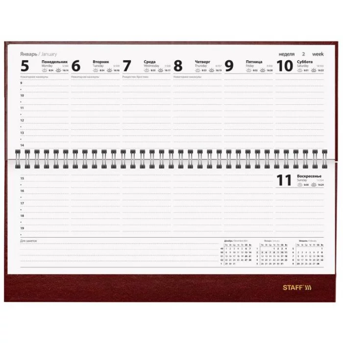 В датированном планинге STAFF все дни недели расположены на одном развороте, благодаря чему очень удобно планировать важные дела на неделю вперед.