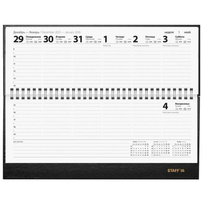 В датированном планинге STAFF все дни недели расположены на одном развороте, благодаря чему очень удобно планировать важные дела на неделю вперед.