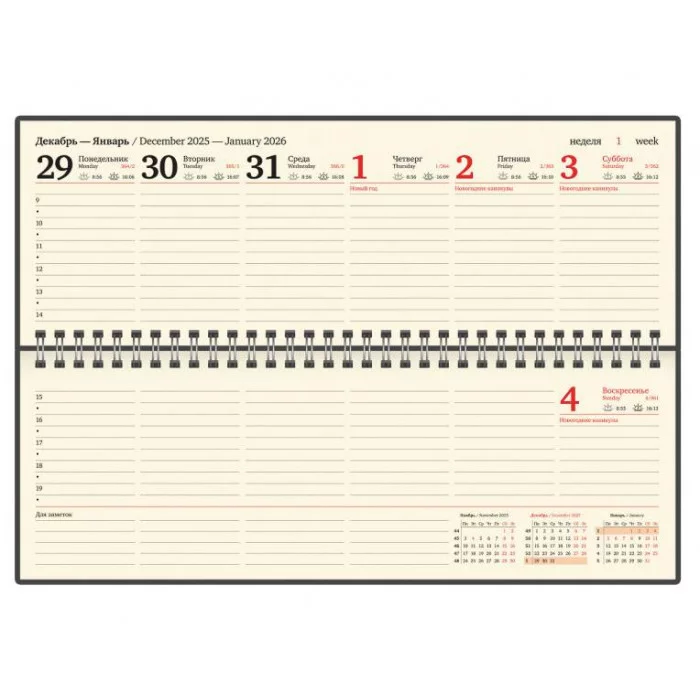 Внутренний блок содержит 60 листов офсетной бумаги кремового цвета плотностью 70 г/м2. Обложка из экокожи красного цвета и твердый переплет обеспечивают долгий срок службы. Для заметок в планинге имеется 11 страниц в конце внутреннего блока. Подходит для горячего тиснения. Скрепление осуществляется с помощью евроспирали. Размер изделия – 305х140 мм.