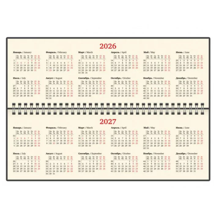 Внутренний блок содержит 60 листов офсетной бумаги кремового цвета плотностью 70 г/м2. Обложка из экокожи и твердый переплет обеспечивают долгий срок службы. Для заметок в планинге имеется 11 страниц в конце внутреннего блока. Подходит для горячего тиснения. Скрепление осуществляется с помощью евроспирали. Размер изделия – 305х140 мм.