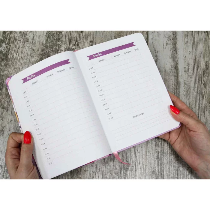 Ежедневники мастера имеют удобный формат А5 и твёрдую обложку с закруглёнными углами. Внутри 88 листов, которые разделены на несколько блоков: страницы для записи клиентов, доходов, расходов и закупки материалов. С помощью ляссе (закладка), можно быстро найти нужную страницу.