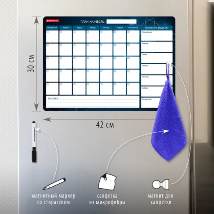 Магнитный планинг BRAUBERG - незаменимый помощник в искусстве тайм-менеджмента. Предназначен для письма маркерами для белых досок и меловыми маркерами. Это гибкая магнитная доска, которая легко крепится к гладким металлическим поверхностям. Это идеальный инструмент для личного планирования, заметок или переписок со своими домочадцами, рисования или черчения графиков, ведения учёта калорий или продуктов, необходимых для покупки. С нашим планингом Вы никогда не забудете ни об одном ближайшем важном событии!Магнитный планинг имеет многоразовую поверхность "пиши-стирай", выполненную из ПВХ.В комплекте: черный маркер для белых досок с магнитом и стирателем в колпачке, салфетка из микрофибры (с «ушком» для подвешивания) и магнит специальной формы, удобной для подвешивания тряпочки. Во избежание преждевременного высыхания маркер рекомендуется хранить на холодильнике, колпачком вниз.Особенности:-подходит для письма и рисования специальными маркерами для белой доски;-легко примагничивается к любой гладкой и ровной мет