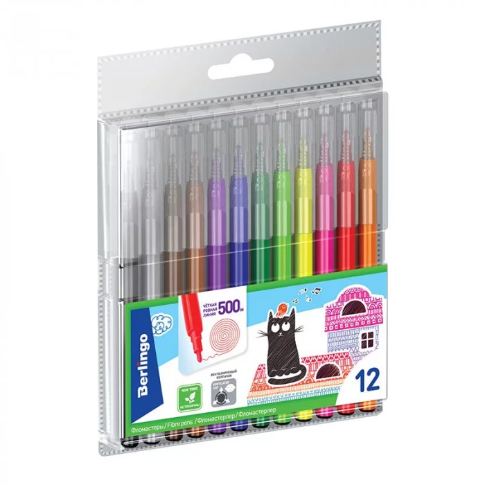 Фломастеры Berlingo серии «Жил-был кот» представлены с легкосмываемыми чернилами и вентилируемым прозрачным колпачком.Толщина линии составляет 2 мм, а длина линии письма - не менее 500 метров. В наборе 12 ярких цветов: красный, синий, зелёный, светло-зелёный, розовый, фиолетовый, светло-коричневый, коричневый, жёлтый, оранжевый, чёрный, серый. Корпус круглой формы изготовлен из полипропилена и имеет удобную круглую зону захвата. Тип наконечника – конический. Смываемые фломастеры на водной основе нетоксичны. Набор фломастеров упакован в блистер с европодвесом. Количество цветов: 12; Тип наконечника: конический; Длина линии письма: 500 метров.