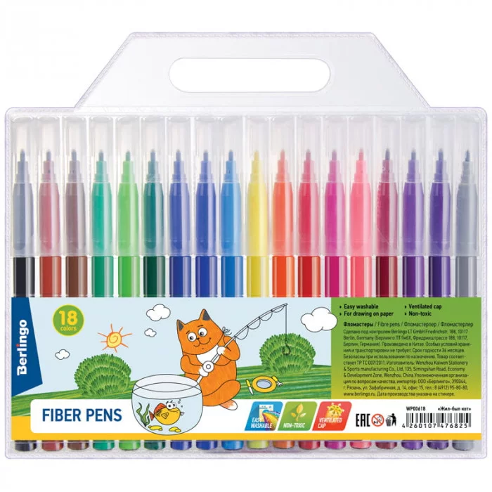 Фломастеры Berlingo серии «Жил-был кот» представлены с легкосмываемыми чернилами и вентилируемым прозрачным колпачком.Толщина линии составляет 2 мм, а длина линии письма - не менее 500 метров. В наборе 18 ярких цветов. Корпус круглой формы изготовлен из полипропилена и имеет удобную круглую зону захвата. Тип наконечника – конический. Смываемые фломастеры на водной основе нетоксичны. Набор фломастеров упакован в блистер с европодвесом. Количество цветов: 18; Тип наконечника: конический; Длина линии письма: 500 метров.