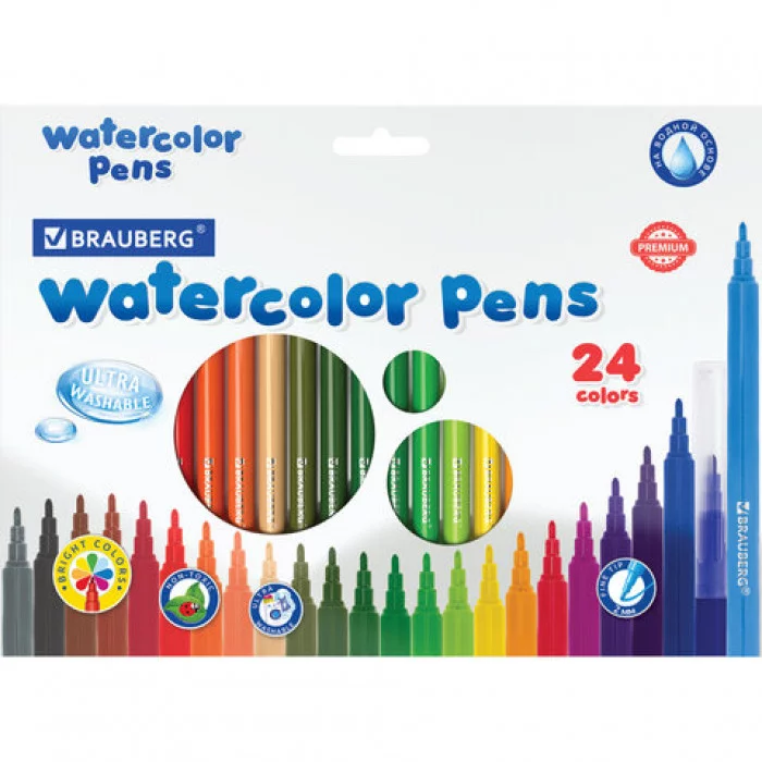 Фломастеры BRAUBERG "PREMIUM", 24 цвета, УЛЬТРАСМЫВАЕМЫЕ, классические, вентилируемый колпачок, картонная коробка с европодвесом, 151940