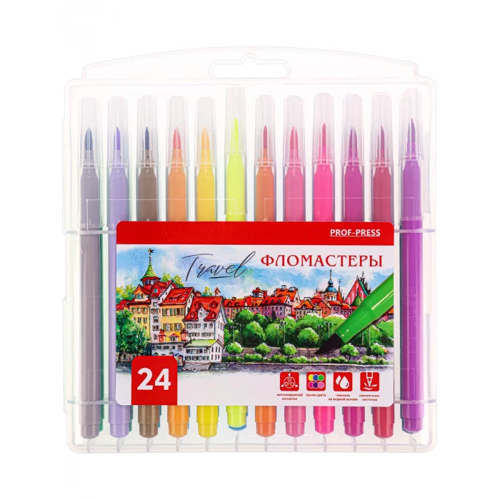 Фломастеры — это друзья детства каждого ребенка! Они не только помогают развитию мелкой моторики, но и способствуют выражению своих эмоций через рисунок! Яркие насыщенные цвета и качество — это всё, что нужно для красивого рисунка и хорошего настроения! Фломастеры от компании "Проф-Пресс" представлены в наборе из 24 цветов с вентилируемым колпачком. Чернила изготовлены на водной основе. Наконечники фломастеров выполнены в виде кисточек . Продаются в пластиковом кейсе.
