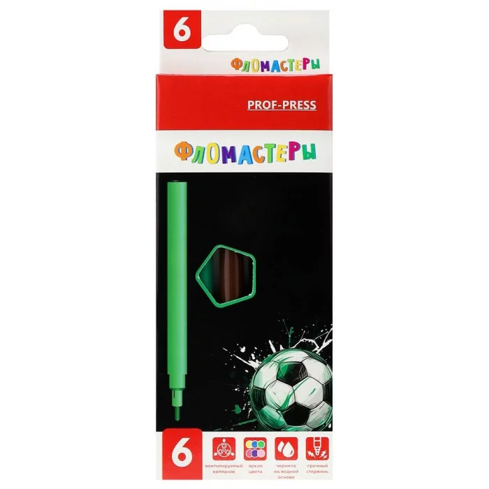 Фломастеры с вентилир колпачком 6цв. МЯЧ НА ЧЕРНОМ (ФЛ-4892) в картон.коробке, ФЛ-4892
