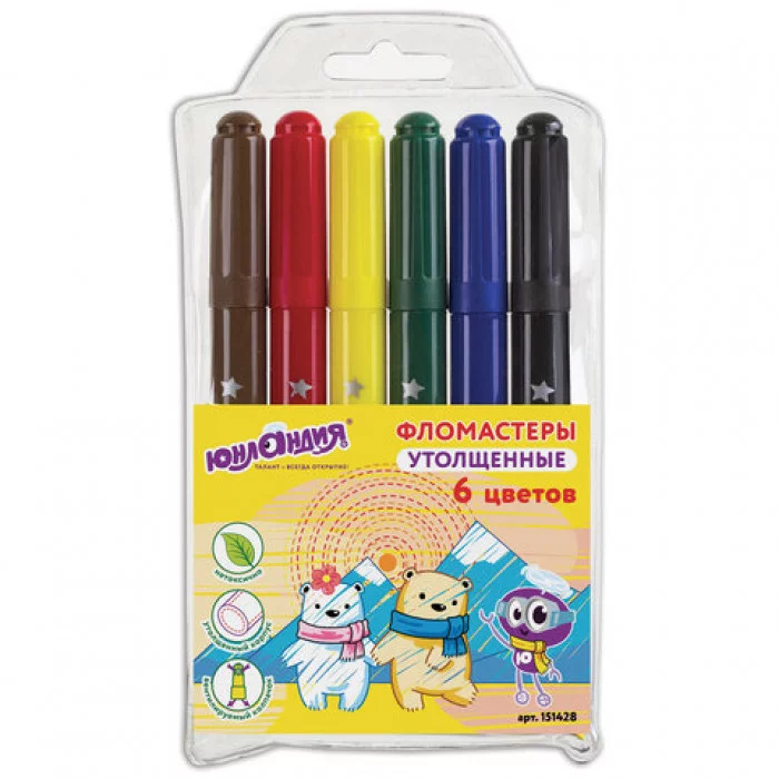 Фломастеры ЮНЛАНДИЯ 6 цветов, "ЮНЛАНДИК В АРКТИКЕ", утолщенные, ударопрочный наконечник, ПВХ, 151428