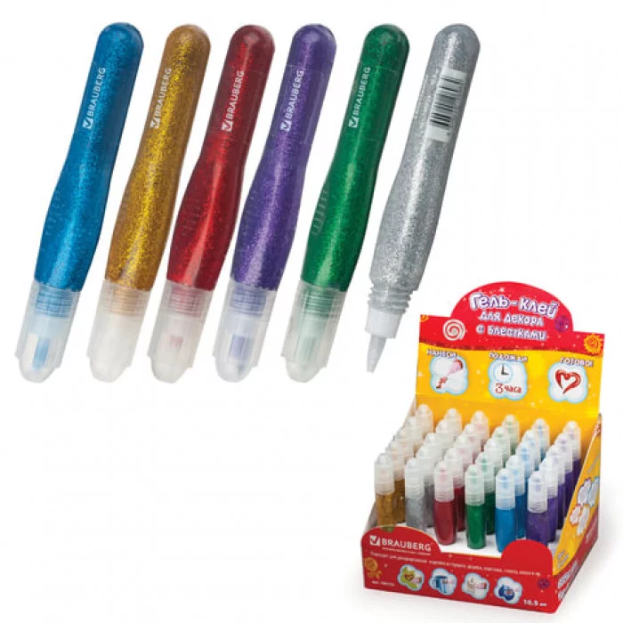 В наборе 6 цветов: золотой, серебряный, красный, синий, зеленый и фиолетовый. Объем тубы - 10,5 мл. После нанесения основной состав геля высыхает, а на декорируемой поверхности остаются искрящиеся блестки. Рекомендован для детей от 3-х лет. Стикер с индивидуальным штрих-кодом на каждой тубе. Упаковка - дисплей. Поставляется в нескольких вариантах цвета (без возможности выбора).Гель-клей с блестками BRAUBERG станет отличным дополнением для любой поделки в детском и взрослом творчестве. Товары для творчества и не только приобретайте в нашем интернет-магазине!