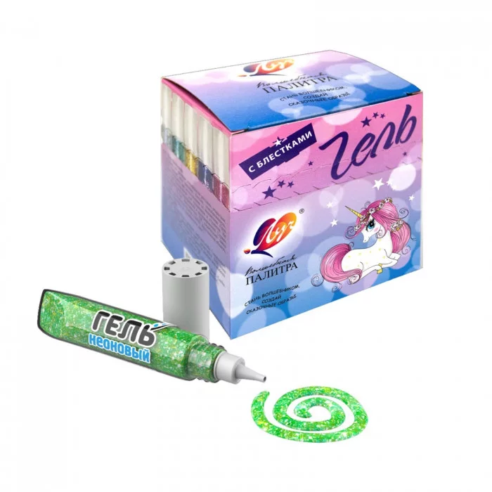 Неоновый гель предназначен для придания необычных переливающихся эффектов, легко наносится на любую поверхность, при высыхании становится прозрачным, оставляя блестки. Используется для украшения рисунков, открыток, поделок из глины, гипса, воска, солёного теста, фольги, стекла и т. п. Время высыхания геля зависит от толщины слоя. Не имеет запаха. Безопасен для детей.