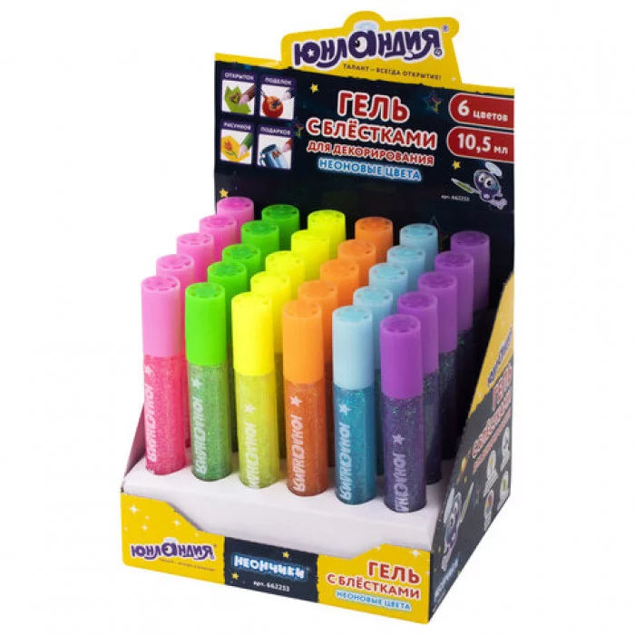 Гель с блёстками ЮНЛАНДИЯ - это блестящие наборы для творчества и украшения открыток, поделок, рисунков и подарков. Удобный наконечник с дозатором позволяет легко наносить гель на любую поверхность. В наборе содержится 30 туб гель-клея с блёстками объёмом 10,5 мл 6 различных неоновых цветов - розовый, жёлтый, зелёный, оранжевый, голубой, фиолетовый.Удобная упаковка позволяет легко работать с гель-клеем: просто снимите колпачок с тубы, и нанесите гель-клей на изделие через тонкий наконечник. По окончании работы удалите лишний гель с наконечника и плотно закройте колпачок, чтобы предотвратить засыхание геля. После нанесения на поверхность гель высохнет в течение нескольких часов в зависимости от толщины нанесённого слоя, а на поделке останутся искрящиеся блёстки.Гель-клей подходит для использования с различными типами поверхности: бумага, картон, дерево, пенопласт, пластик, стекло, керамика.Гель-клей не токсичен, легко смывается с рук и одежды тёплой водой с мылом.